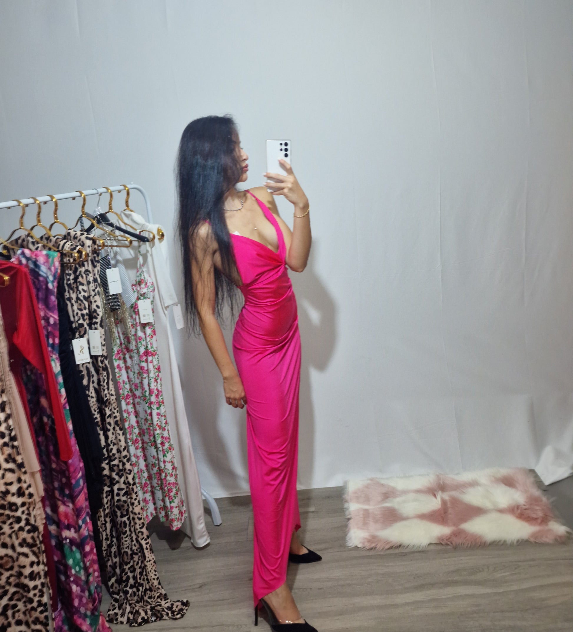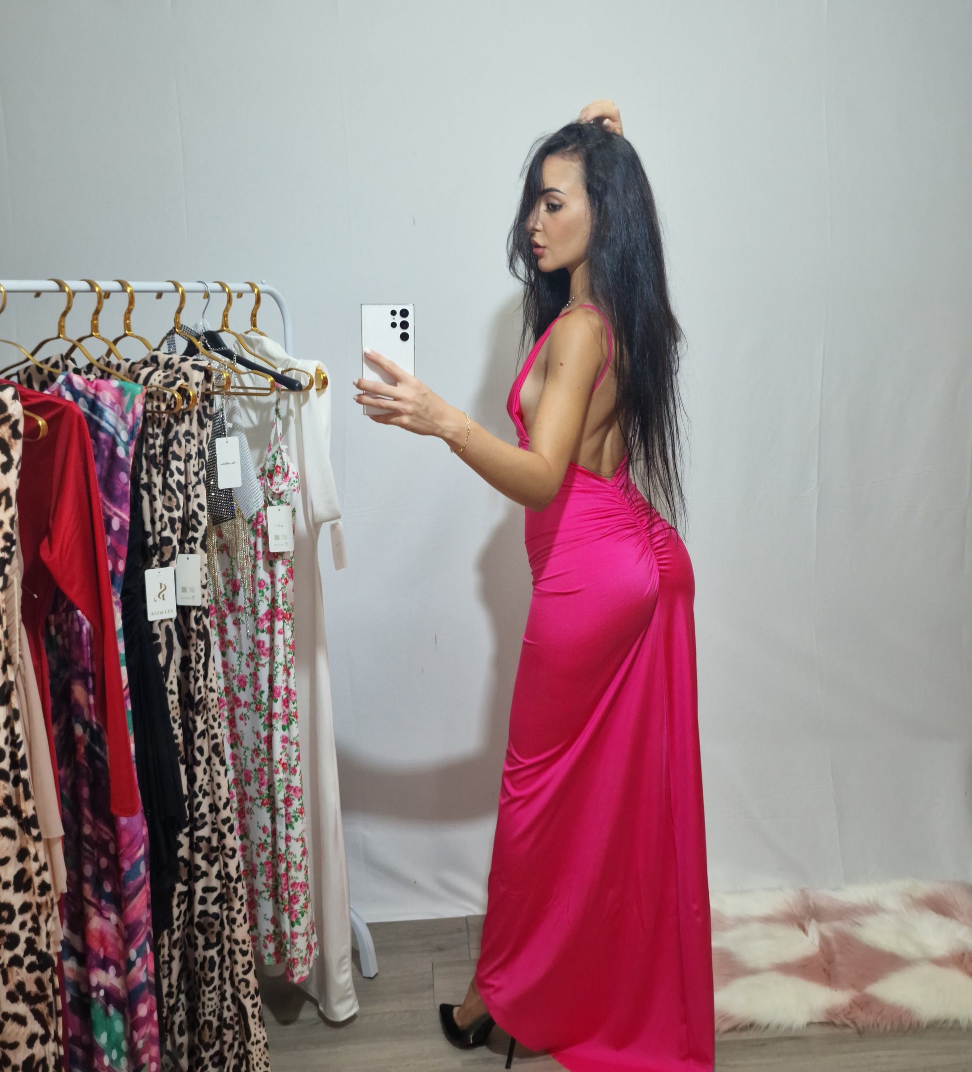Abito lungo con schiena scoperta, perfetto per serate eleganti e cerimonie. Entrambi i modelli offrono stile unico, tessuti di qualità e design che valorizzano la figura.