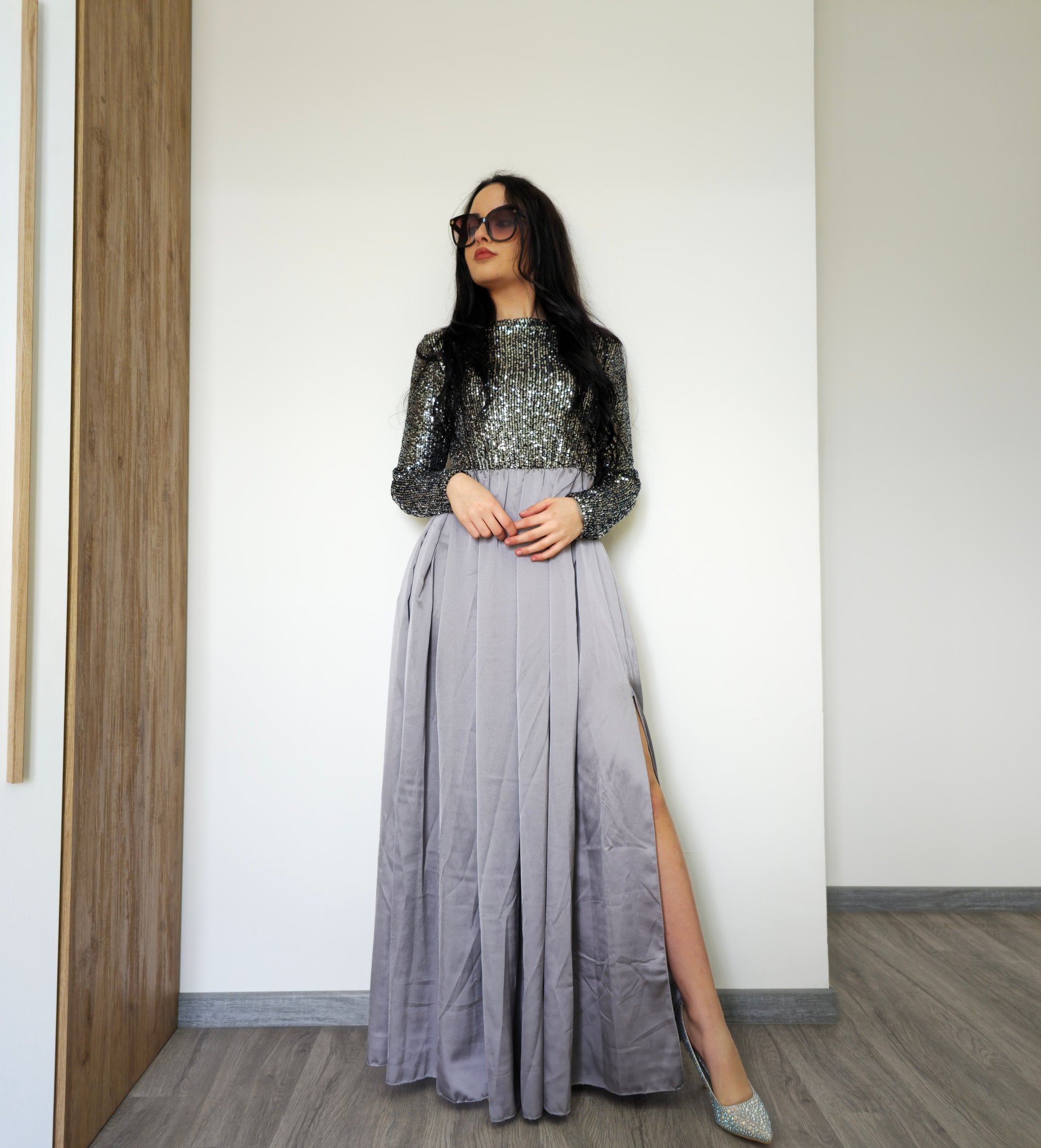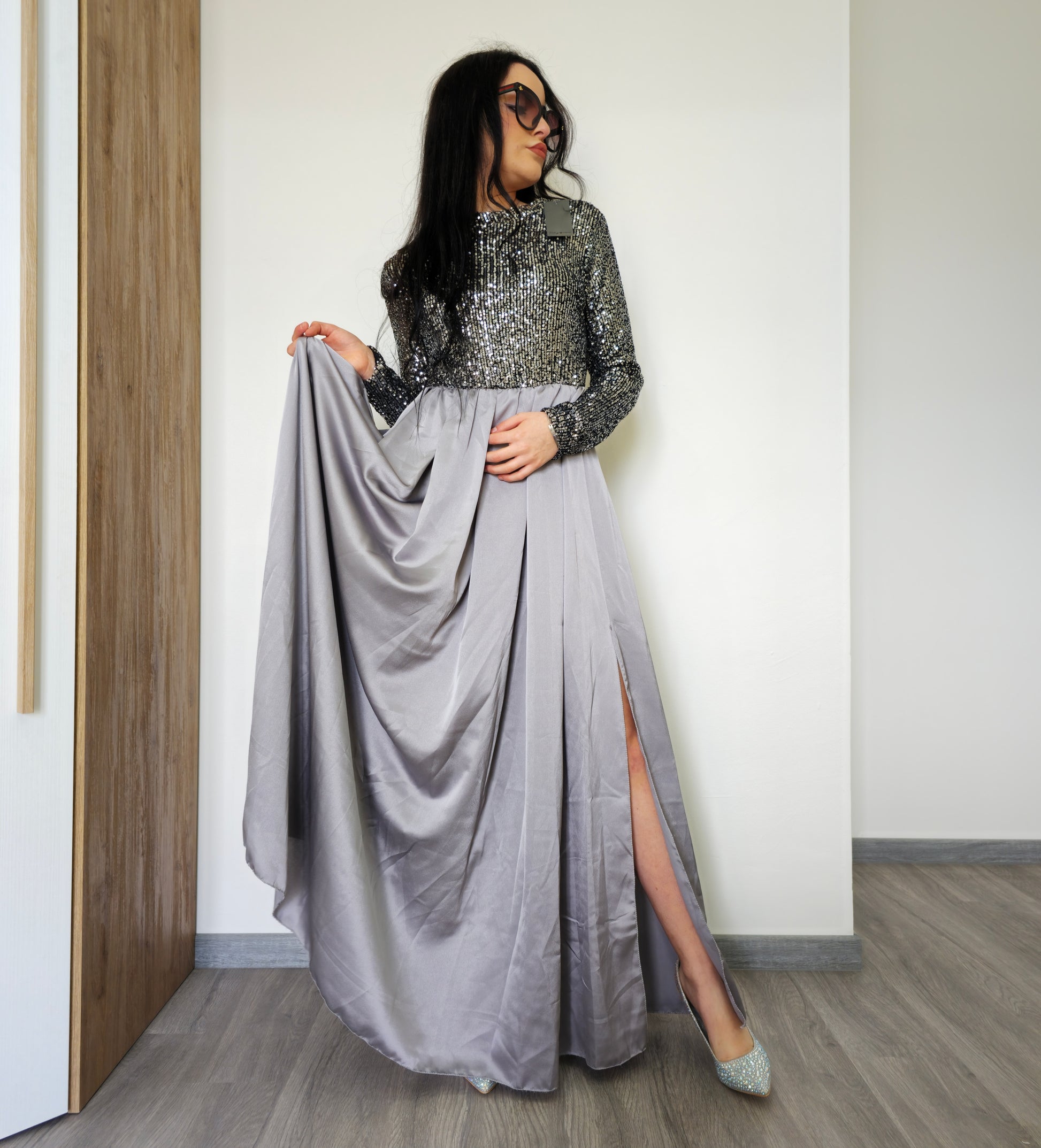 Questo abito incarna l'essenza della raffinatezza e della femminilità, con una silhouette che incanta e una luminosità che cattura lo sguardo. La gonna ampia fluisce delicatamente lungo le curve, conferendo un tocco regale ad ogni passo, mentre il sopra decorato con paillettes argento aggiunge una nota di glamour e sofisticatezza.